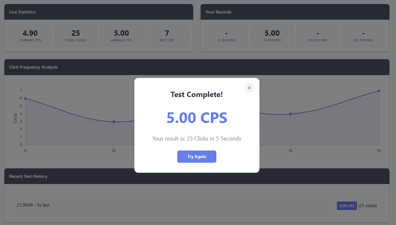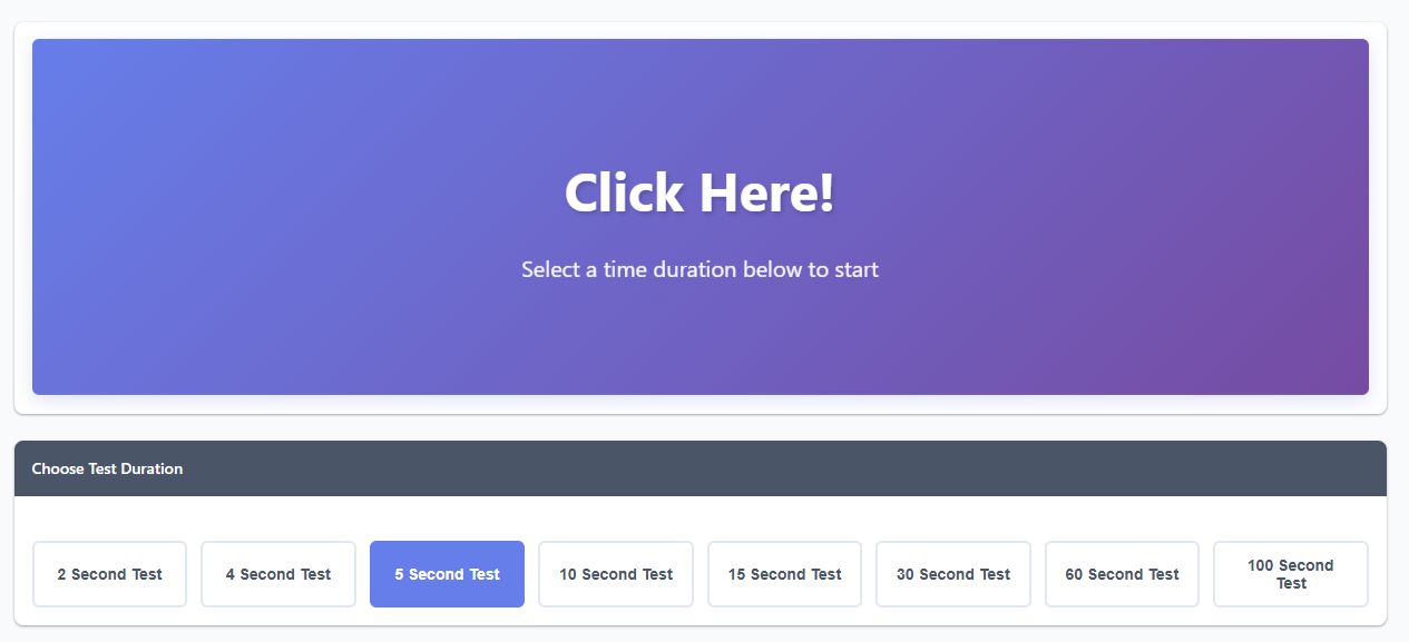 Welcome to the ultimate Click Speed Test! This tool measures how many times you can click in a given timeframe, calculating your CPS (Clicks Per Second). Whether you're a gamer looking to improve your reaction time or just curious about your clicking speed, we've got you covered!