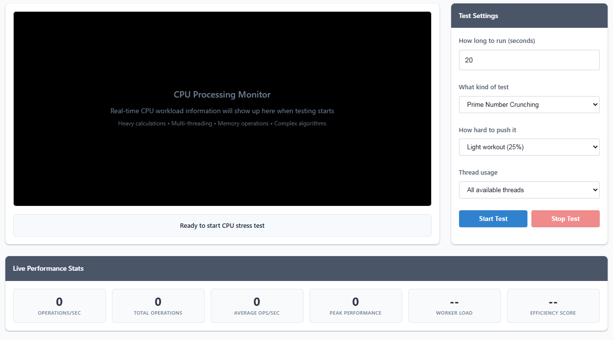 Heads up: Browser-based testing has limitations compared to native stress testing software. For serious overclocking validation, consider using tools like Prime95 or AIDA64 alongside this web-based test.