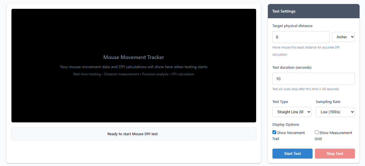 Our DPI tester tracks every pixel your mouse moves, calculates the physical distance (based on your input), and gives you real-time data on: