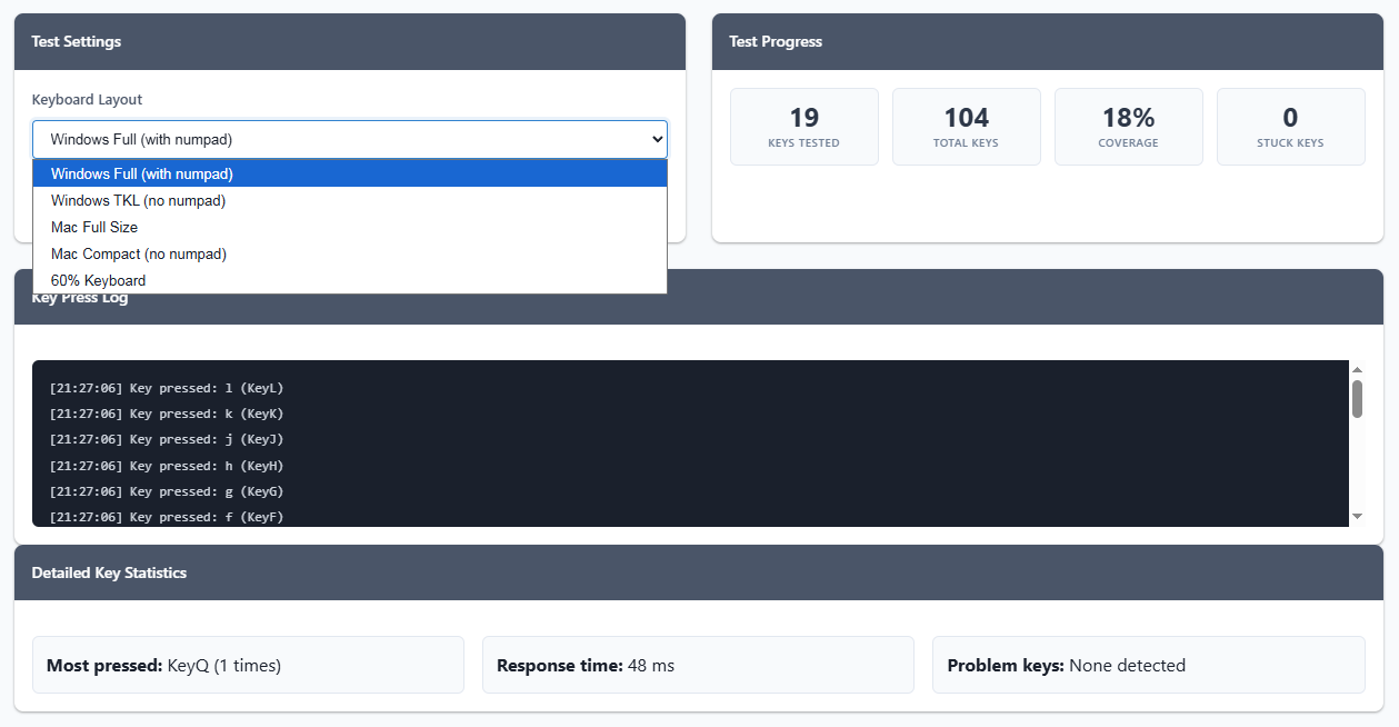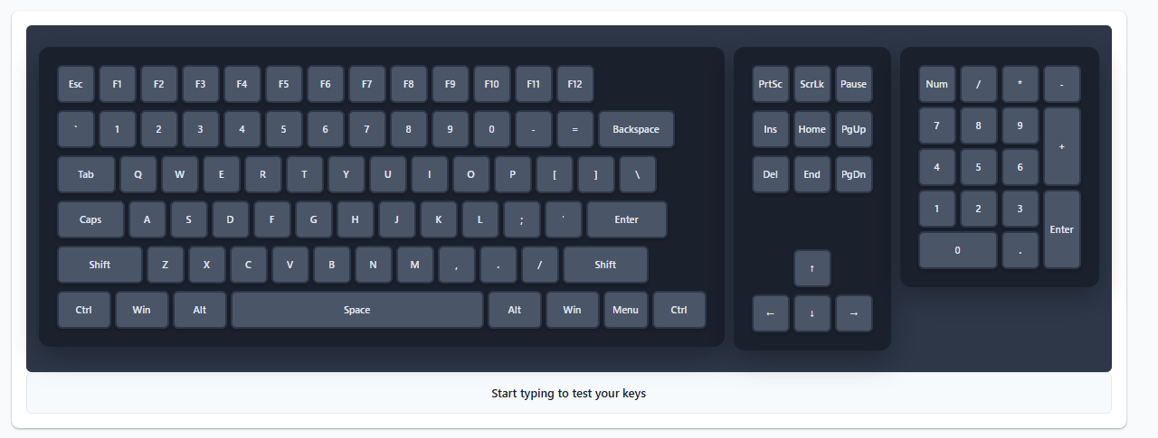 This tool helps you check if every key on your keyboard is working properly. Whether you just bought a new mechanical keyboard, spilled coffee on your laptop, or want to test your gaming keyboard's response time - we've got you covered.