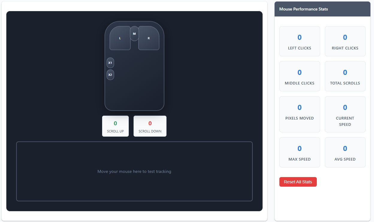 This mouse testing tool lets you check if all your mouse buttons are working properly, test your scroll wheel, and see how well your mouse tracks movement. It's super handy for testing new mice, checking if your gaming mouse is working right, or just seeing what your mouse can do.